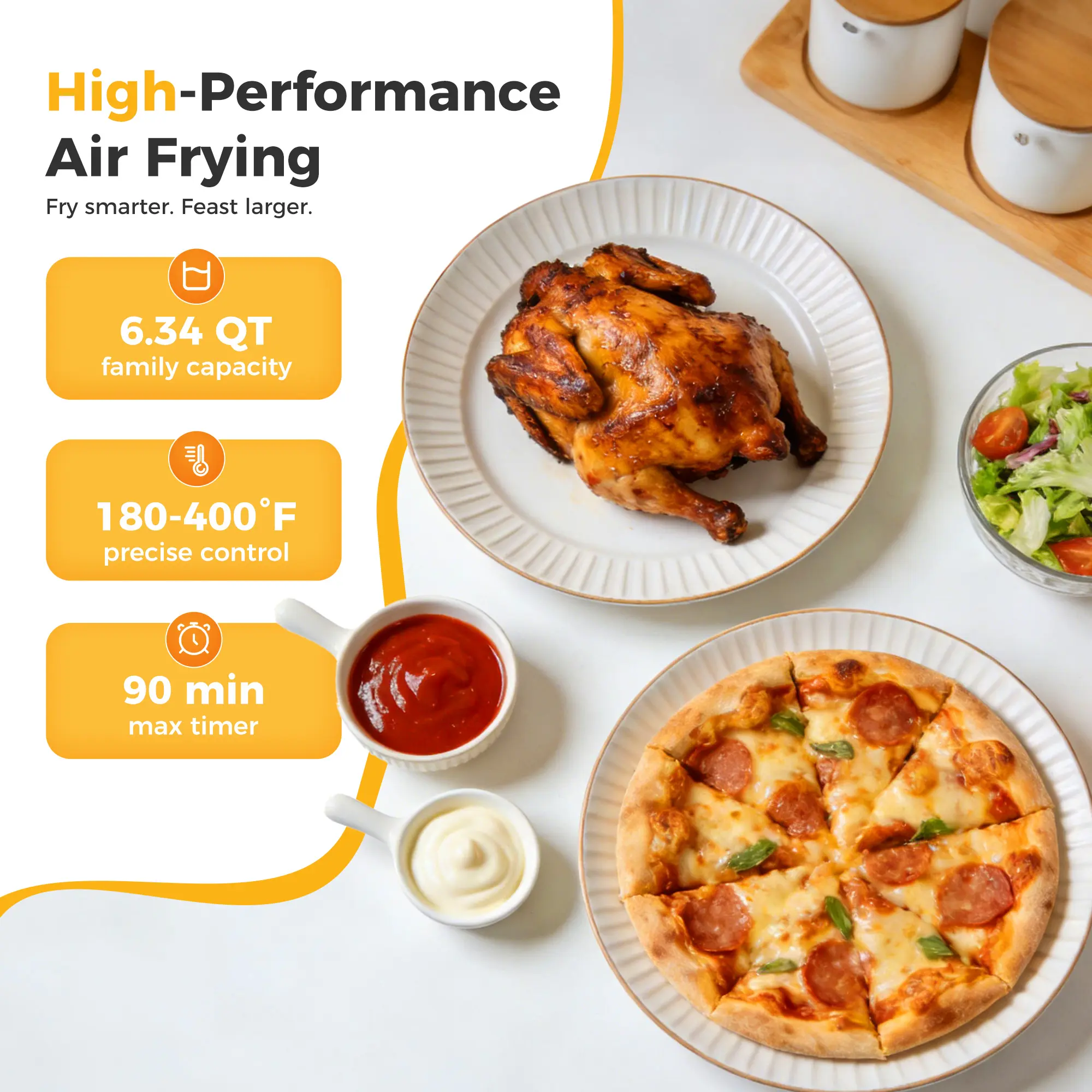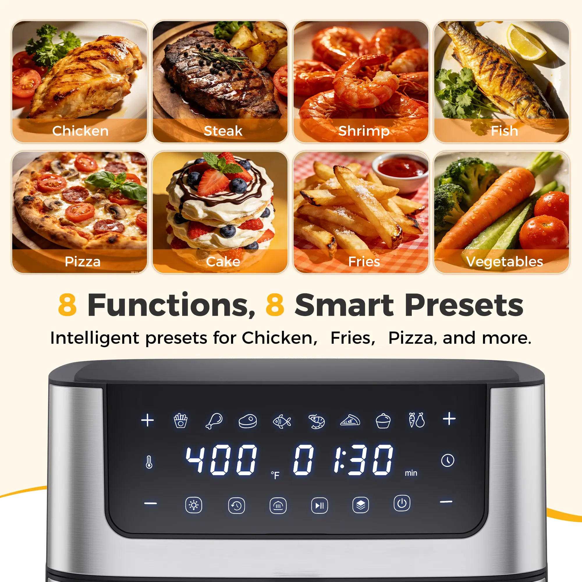 Ocho menús preestablecidos, que incluyen papas fritas, pollo y bistec, te ayudan a preparar deliciosas comidas sin esfuerzo. Esta freidora de aire digital ofrece resultados crujientes y deliciosos, facilitando la alimentación saludable; incluso los principiantes en la cocina pueden dominarla fácilmente.