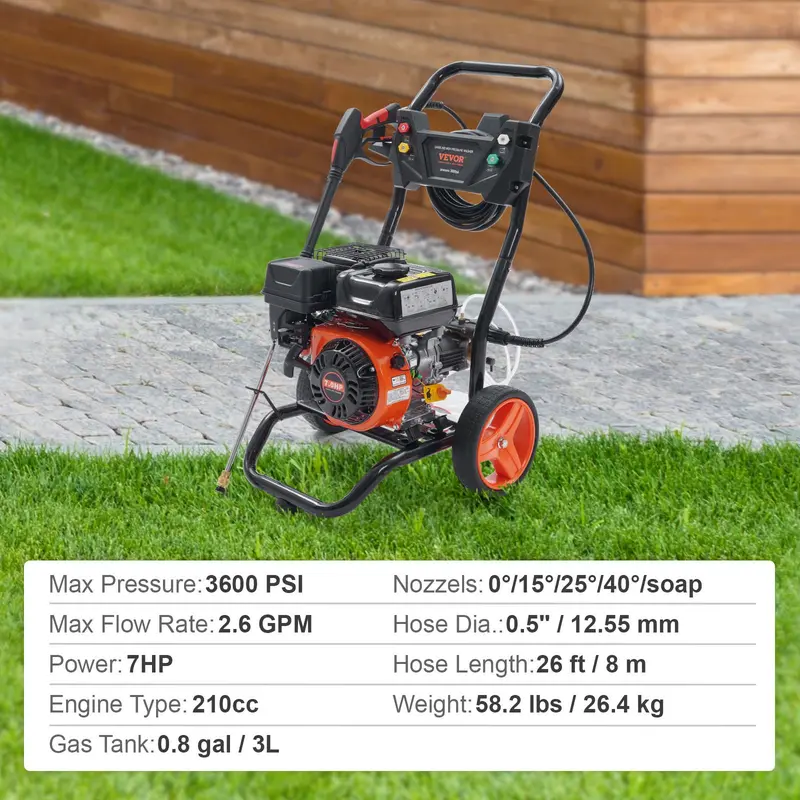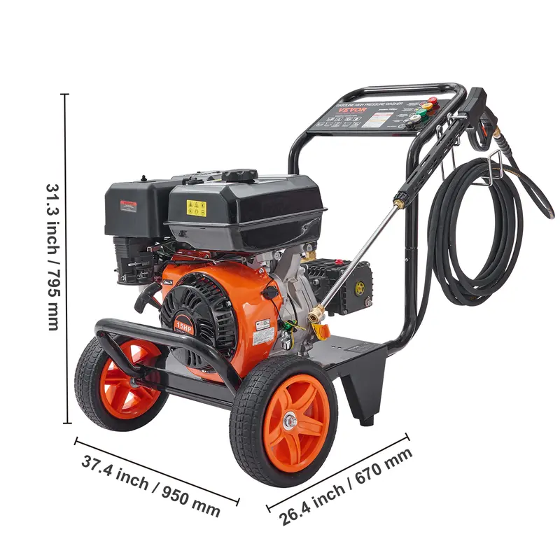 • Motor eficiente de 15 HP: Esta hidrolavadora a gasolina cuenta con un potente motor de 390 cc y 4 radios, y tiene una capacidad de 0.8 galones de gasolina. Es fácil de arrancar y tiene una bomba de cobre. Si le gusta el bricolaje y valora la potencia y el rendimiento, esta es una excelente opción.
