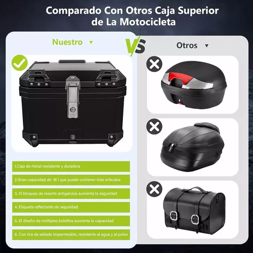 Gran capacidad de almacenamiento de 46 litros: la gran capacidad de 46 litros hace que sea libre de preocupaciones por el almacenamiento de cascos, impermeables, guantes y otros equipos de conducción. Tamaño de la caja exterior: 42*34*35 cm.Peso: 3.8 kg. El Top Case tiene capacidad de 46 litros, para almacenar.casco.impermeables.guantes.alimentos y otros equipos e conducción. proporciona espacio de almacenamiento seguro y eficiente, y el bloqueo de seguridad puede evitar la pérdida de artículos importantes como cascos, guantes, documentos, etc.