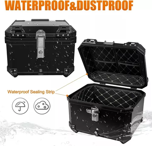 IPX68 a prueba de agua: La carcasa superior de la motocicleta utiliza un alto nivel de protección estándar, nivel 6 a prueba de polvo y nivel 8 a prueba de agua. roteja los artículos importantes de la lluvia y el polvo. No hay cesidad de preocuparse por los cambios de clima. diseño de borde impermeable de la caja superior, forro de cuero, impermeable y resistente a la humedad, protege el contenido de la caja, sin miedo al viento y la lluvia. El Top Case está diseñado para ser impermeable al agua y resistencia al polvo.Protege los objetos de la lluvia y el polvo en días lluviosos. Además, el mango de aluminio hace que sea fácil llevar.