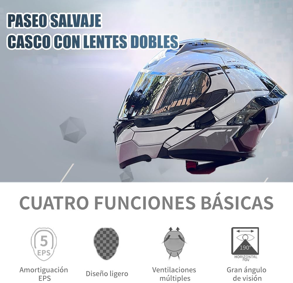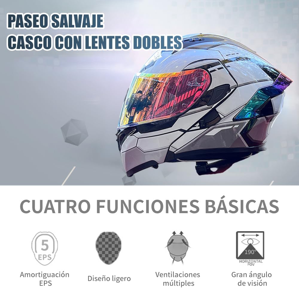 - Versatilidad con Doble Lente y Máscara Plegable: Equipado con lentes dobles, incluyendo una lente de color, este casco se adapta a diversas condiciones de luz y clima. La máscara plegable es perfecta para el verano, proporcionando comodidad y frescura, mientras que en invierno actúa como una barrera contra el viento frío y la lluvia.