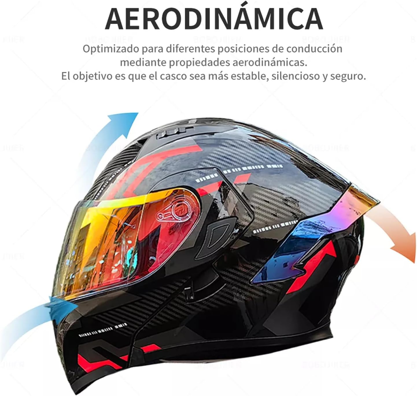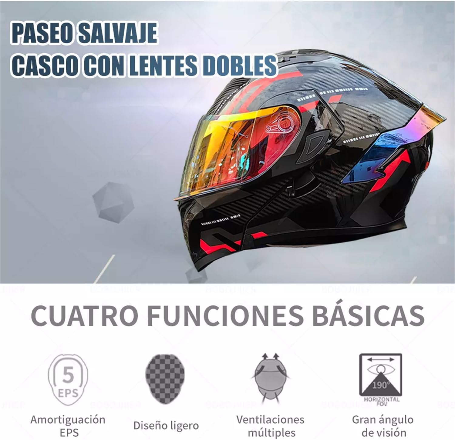 - Estilo y Funcionalidad: No solo esel casco visualmente atractivo, sino también extremadamente funcional. Diseñado para ser robusto y práctico, cada detalle está pensado para mejorar tu experiencia de conducción. Ya sea que estés enfrentando el sol brillante, el frío invierno o la lluvia torrencial, este casco te proporcionará la protección y comodidad que necesitas.