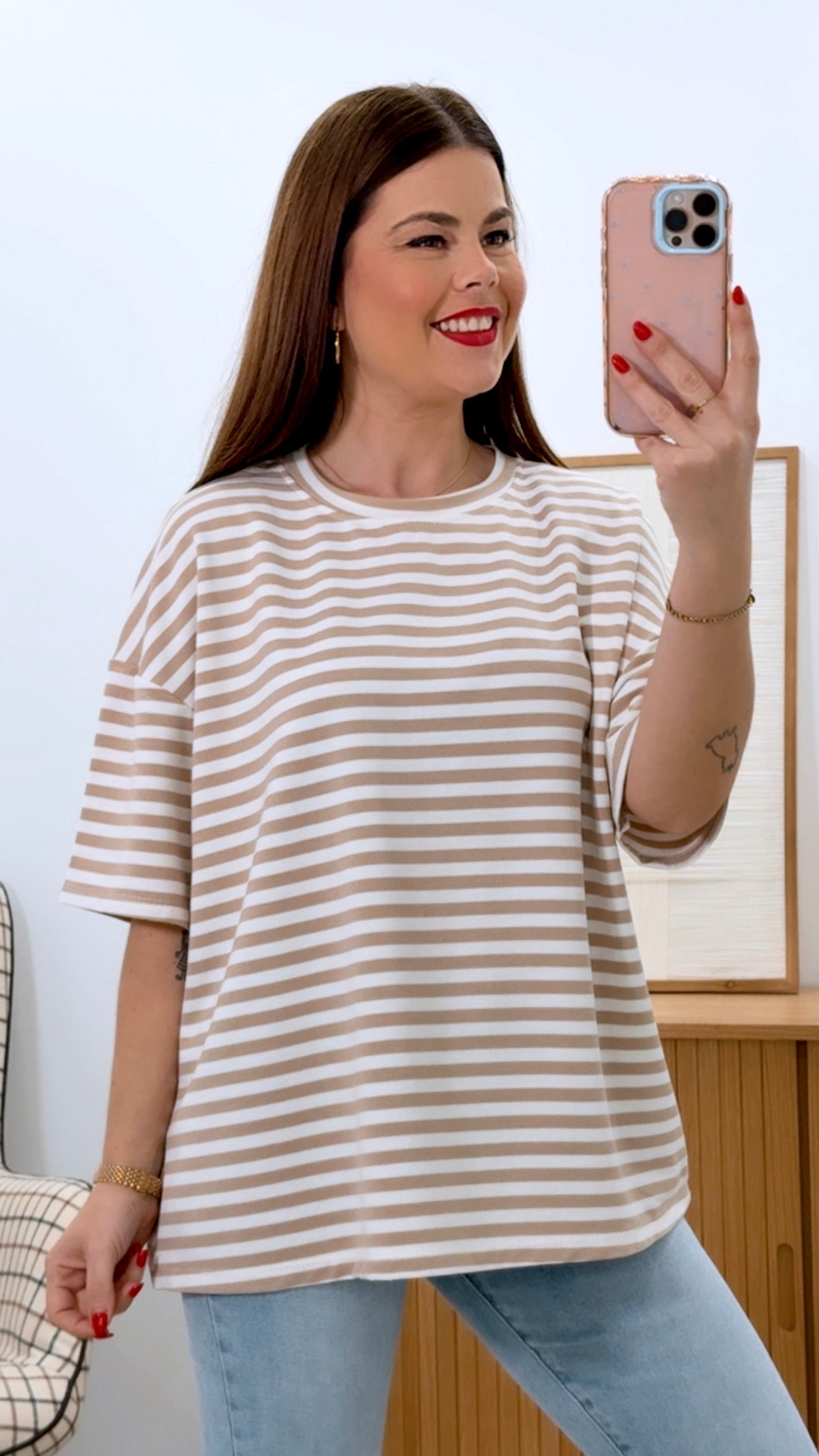 Camiseta básica de corte versátil confeccionada en una mezcla de 95% algodón y 5% elastan que proporciona comodidad y flexibilidad. Presenta un clásico estampado de rayas y cuello redondo con manga corta, ideal para crear looks casuales y atemporales. Talla única que se adapta a diferentes siluetas. Perfecta para el día a día, combina con cualquier prenda de tu armario.