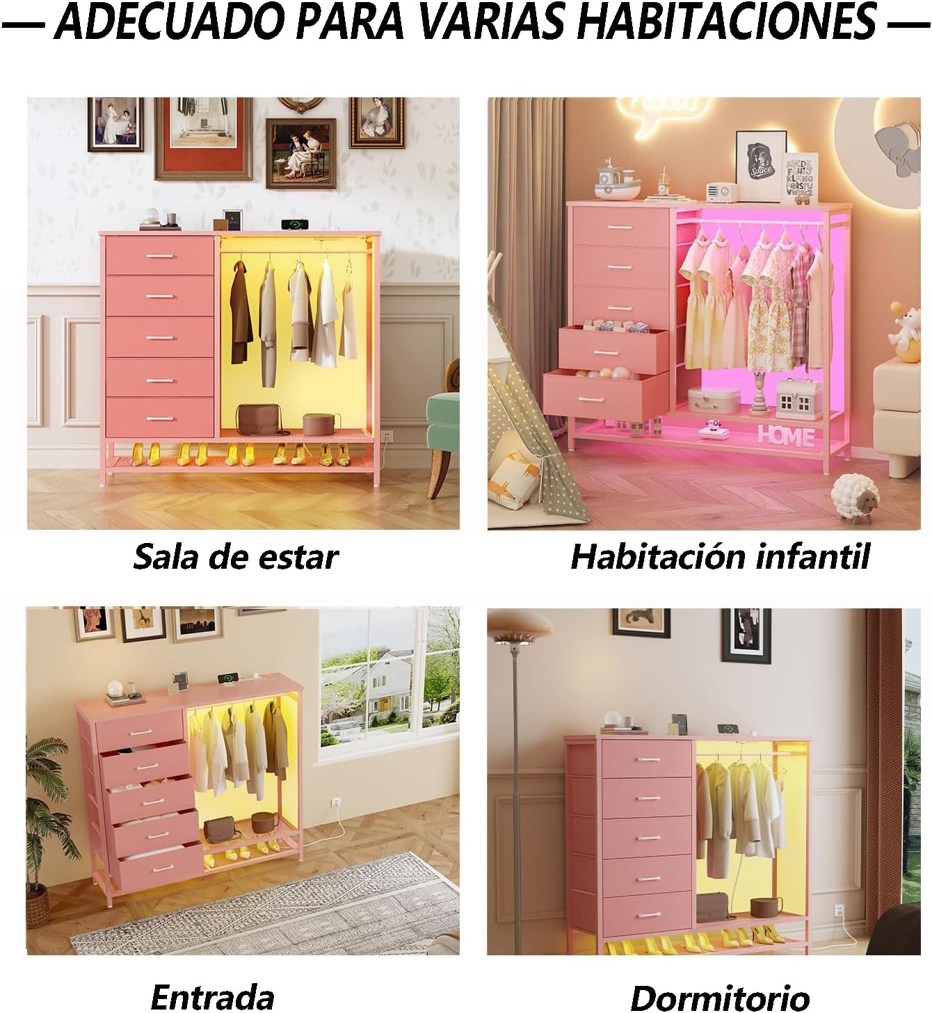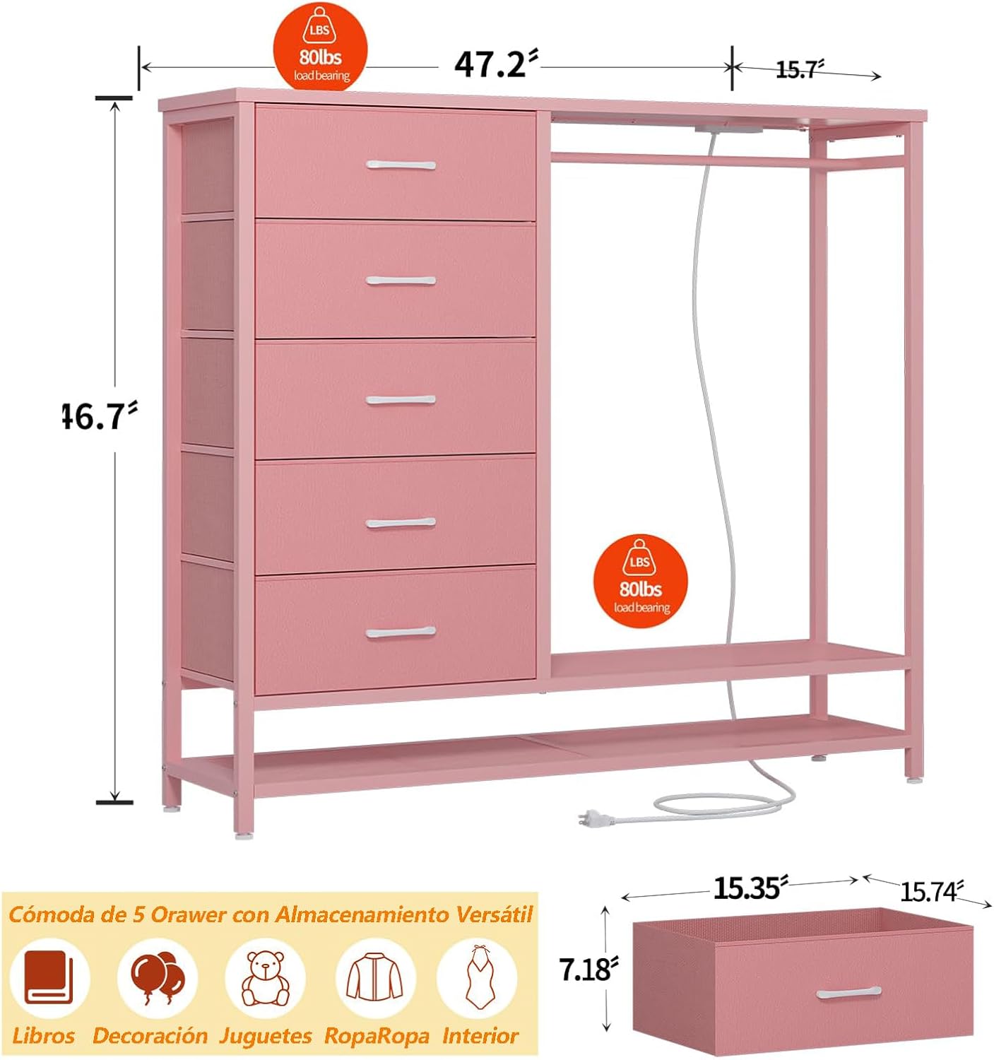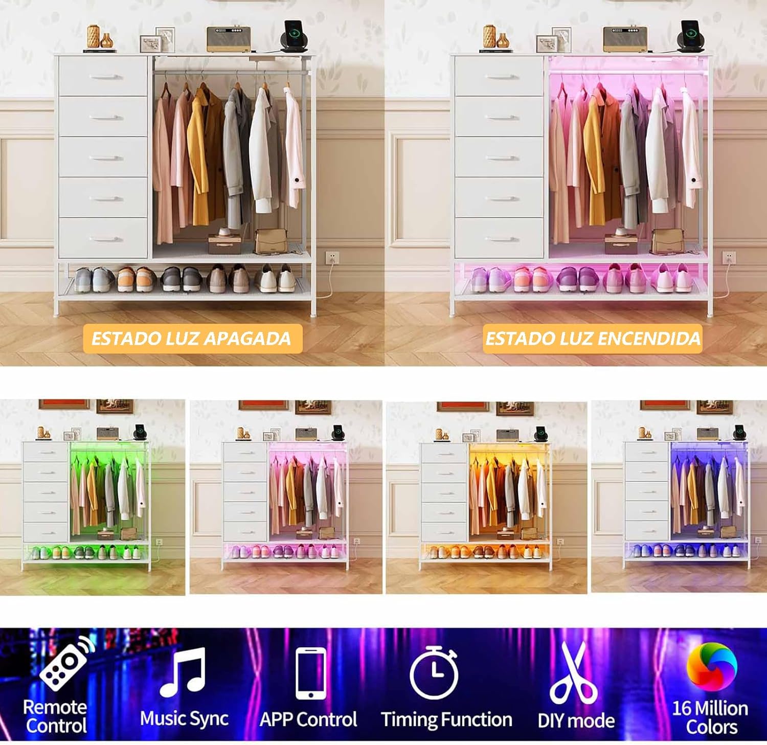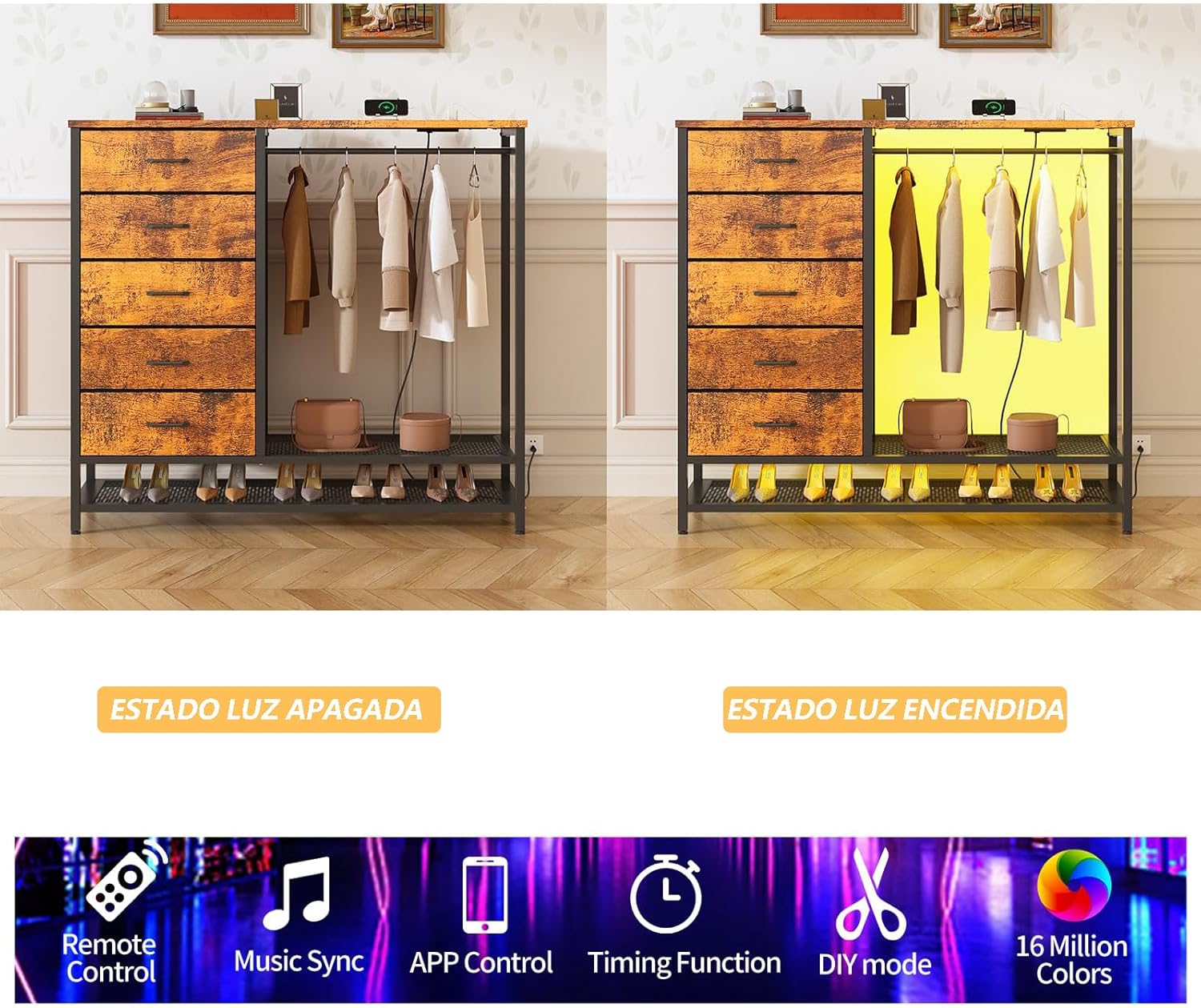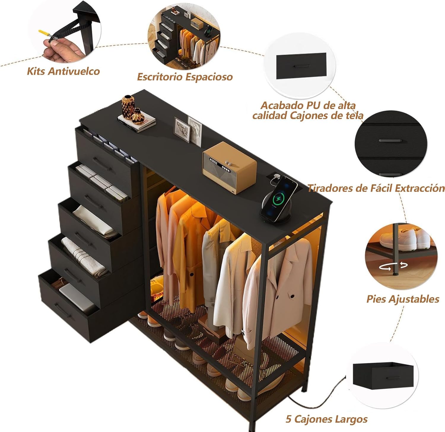 - 【Armario con Cajonera y Perchero Integrado (Diseño 2 en 1)】Este práctico diseño combina un perchero para colgar ropa diaria y espacio para guardar bolsos debajo de la mesa. Junto a la estantería, incluye 5 cajones amplios y profundos con capacidad para:90-120 pares de calcetines,50-60 chaquetas, o 70-80 jeans.Con este armario integrado, organizarás ropa y accesorios de forma cómoda sin necesitar dos muebles separados.