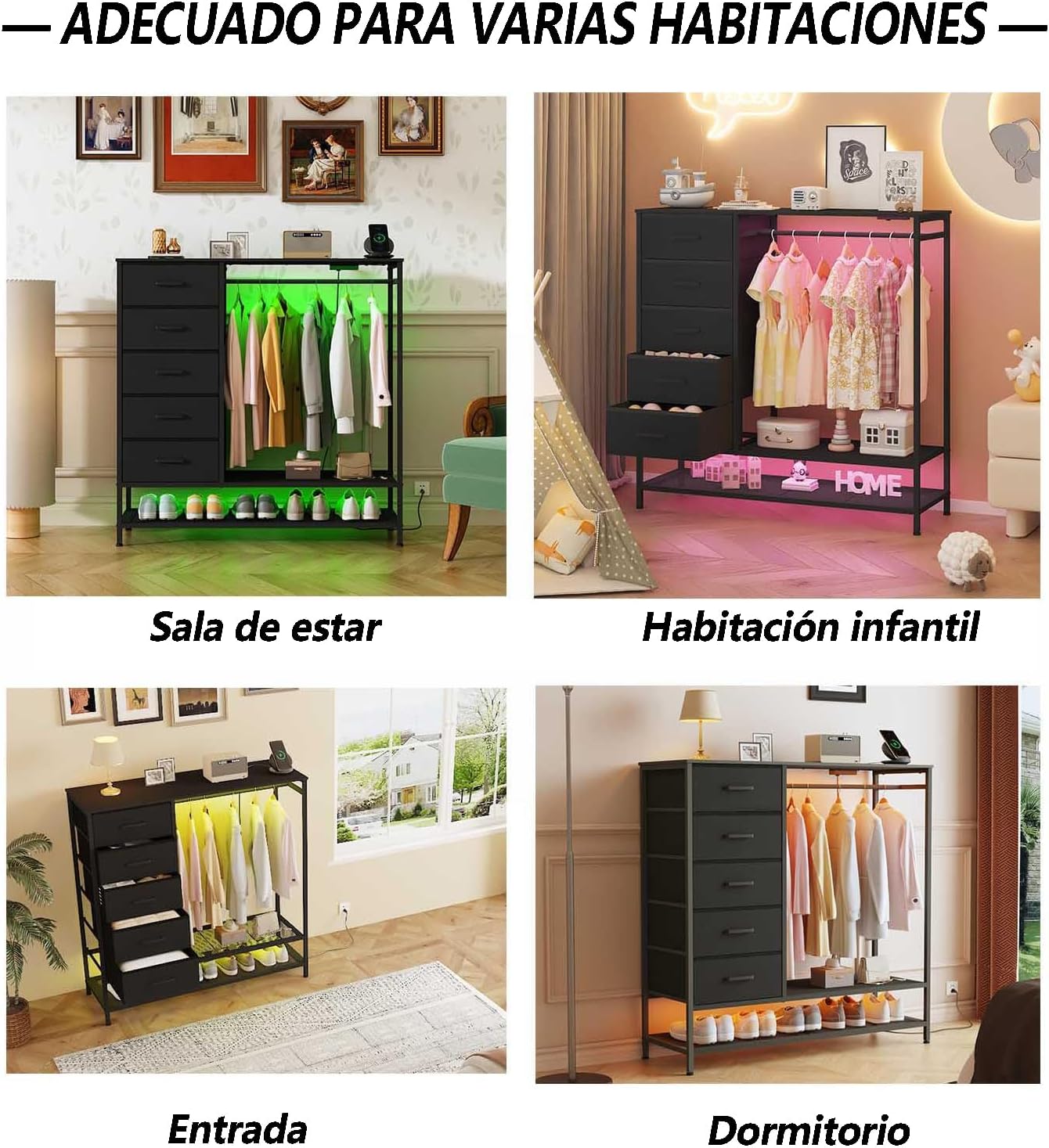 - 【Durabilidad y Seguridad】Materiales Tablero de MDF resistente + tela no tejida, con acabado en poliuretano para mayor protección y fácil limpieza.Estructura reforzada: El marco, la barra colgante y la base del zapatero están fabricados en hierro sólido, garantizando estabilidad total.4 patas ajustables: Se adaptan a suelos irregulares y evitan rayones en el piso.