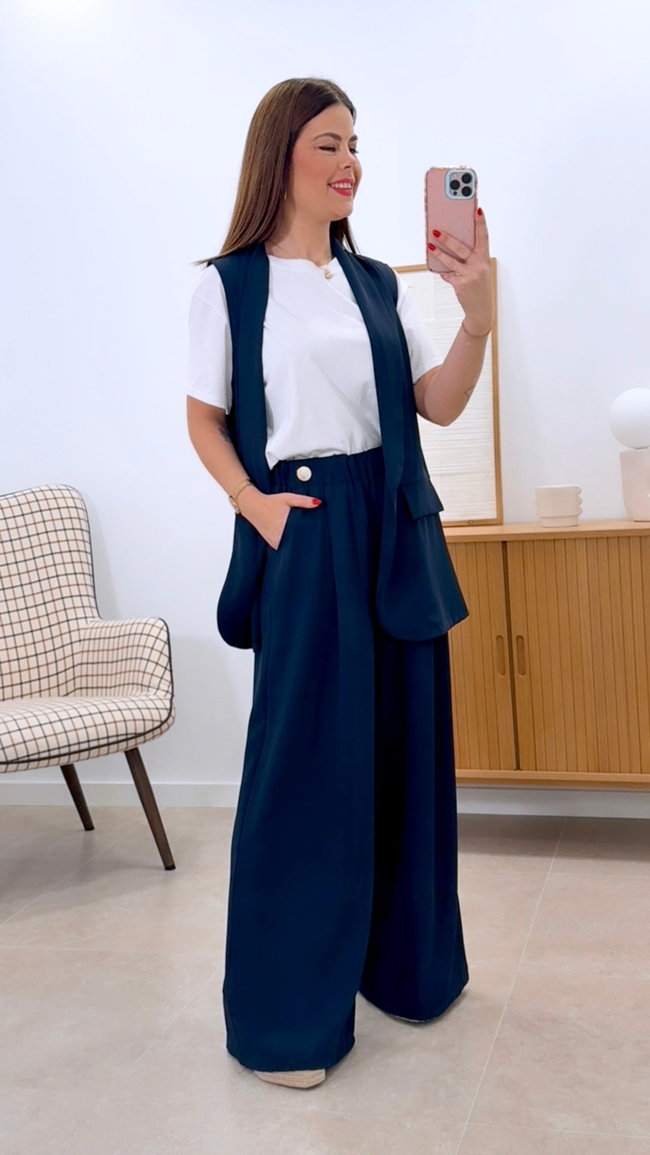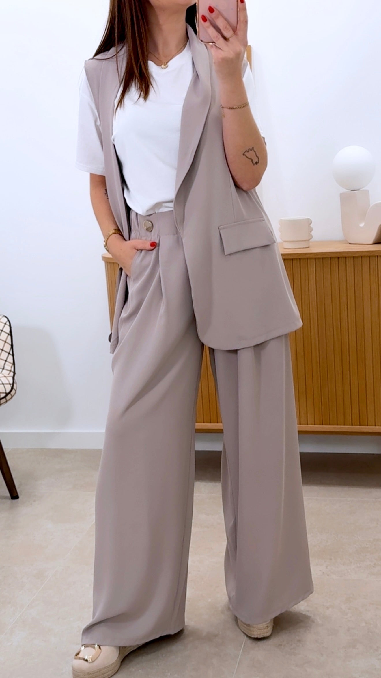 Conjunto versátil compuesto por chaleco abierto y pantalón ancho de cintura engomada. Confeccionado en 100% poliéster de fácil cuidado. El chaleco presenta un corte moderno y desenfadado, mientras que el pantalón destaca por su cintura elástica y botones decorativos que añaden un toque de estilo. Disponible en color liso. Talla única, perfecto para un look casual y cómodo.