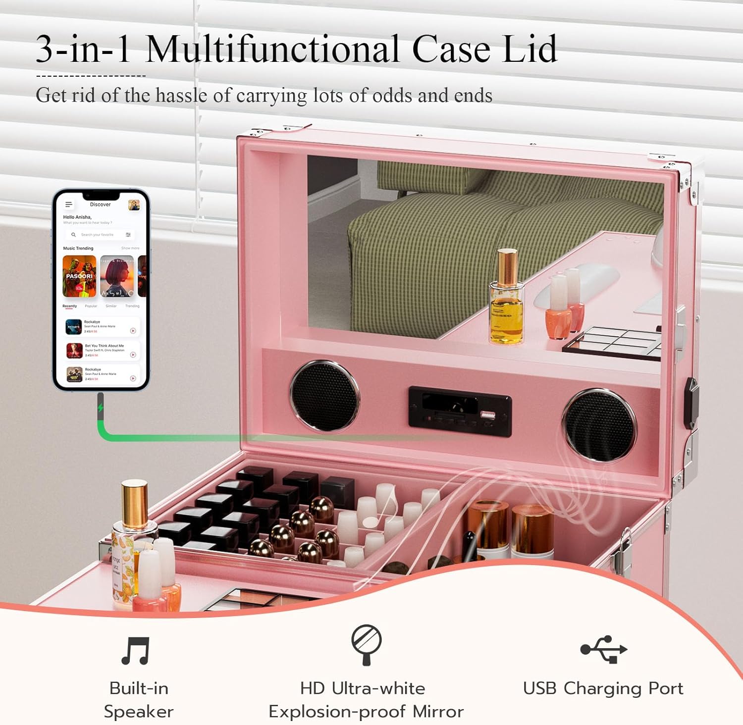 - Ambiente agradable: altavoz integrado que se puede conectar a través de tarjeta SD / puerto USB. La música dinámica añade un ambiente agradable cuando trabajas. También hay un puerto de conexión para cargar tu teléfono. Espejo HD ultra blanco a prueba de explosiones también conveniente para que los clientes revisen su maquillaje en cualquier momento