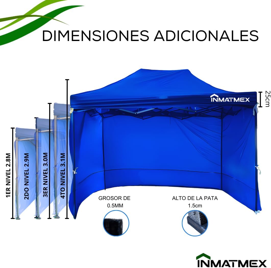 - Nuestra carpa tiene 4 niveles de ajuste de altura mediante sistema de botón lo cual hace sencillo el ajuste. Las medidas de la carpa son Largo: 3 metros Ancho: 2 metros Alto al pico máximo: 3.21 metros Altura sin el pico central: 2.10 metros Tubos de 3cm con grosor de 0.8 mm.
