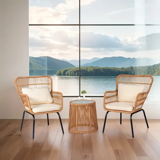 Juego de 3 muebles de mimbre para patio, incluye 2 sillas y una mesa con tapa de vidrio, ideal para porche, exterior, patio trasero, apartamento, balcón, color natural.