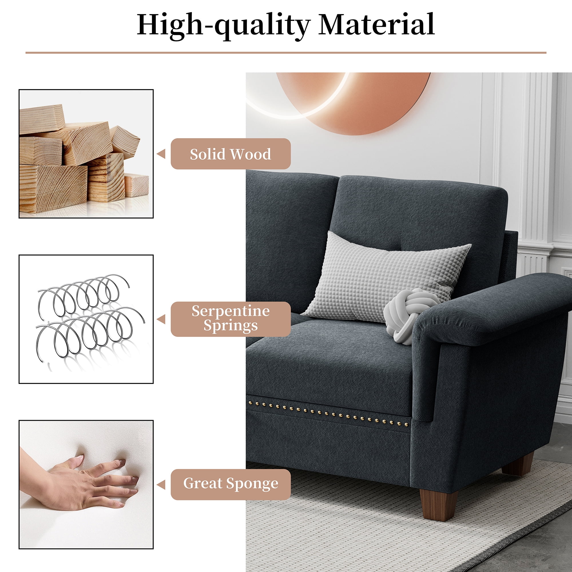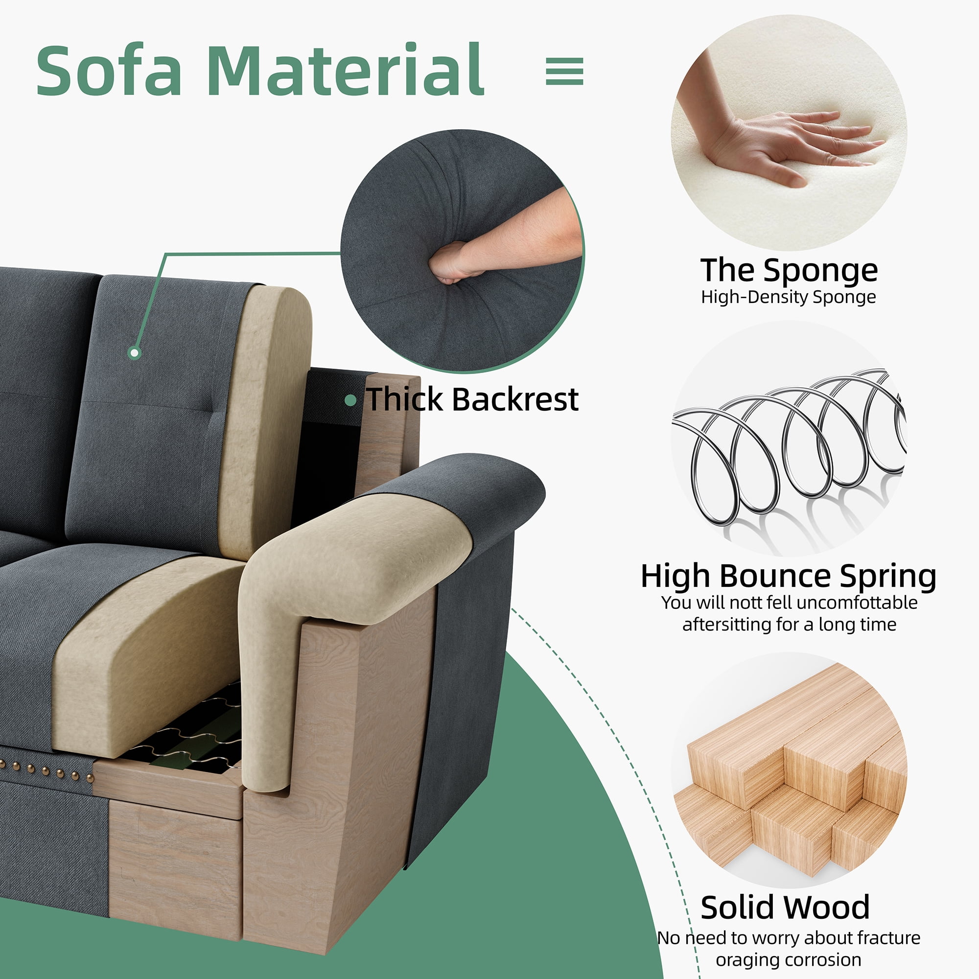 【Sofá cómodo y resistente】Fabricado con una estructura de madera maciza que le aporta robustez y estabilidad para un uso prolongado. El sofá seccional está fabricado con tela de lino de alta calidad, cómoda y transpirable. Su espuma de alta elasticidad proporciona un buen soporte para el cuerpo, ya sea en la sala, el apartamento o la oficina. Este sofá reclinable es el complemento perfecto.