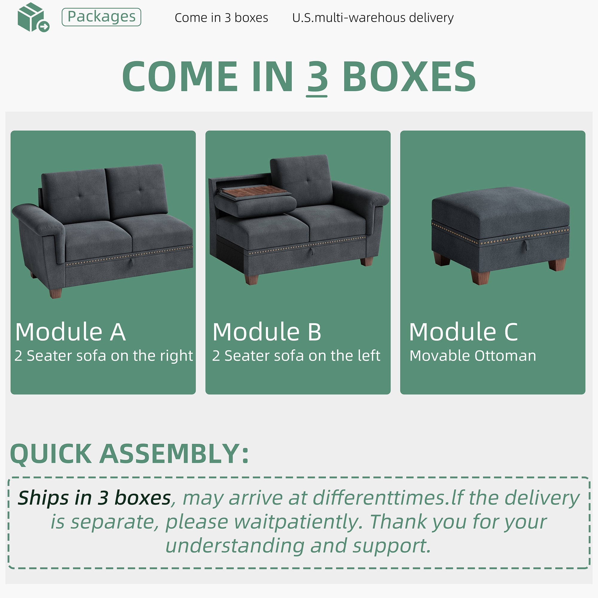 3 paquetes: El sofá seccional con chaise longue se envía en 3 paquetes y puede llegar por separado en unos días. Si esto ocurre, ten paciencia.