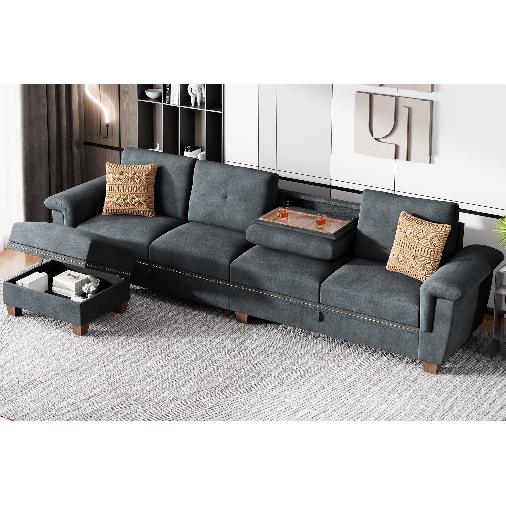 【Espacio de almacenamiento adicional y portavasos】El respaldo del sofá cuenta con un portavasos abatible para colocar bebidas y vasos. Además, cuenta con un amplio espacio de almacenamiento bajo los cojines, donde puede colocar mantas, juguetes, revistas, mandos a distancia, almohadas, etc., para mayor espacio en su habitación.