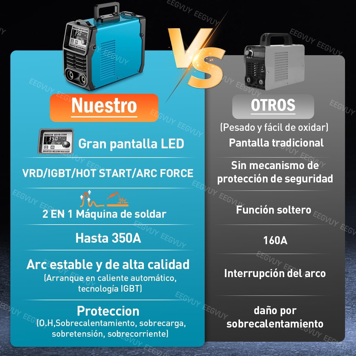 - [Sistema de protección más seguro] Sistema de disipación de calor eficiente de 360°, tecnología IGBT avanzada, ventilador de enfriamiento de alta velocidad, protección contra sobrecalentamiento/sobrecarga, bajo nivel de ruido, basado en VRD, funciones de protección contra sobrecorriente/sobrevoltaje/sobrecorriente/sobrecarga/sobretemperatura para cuidar la seguridad del cliente.