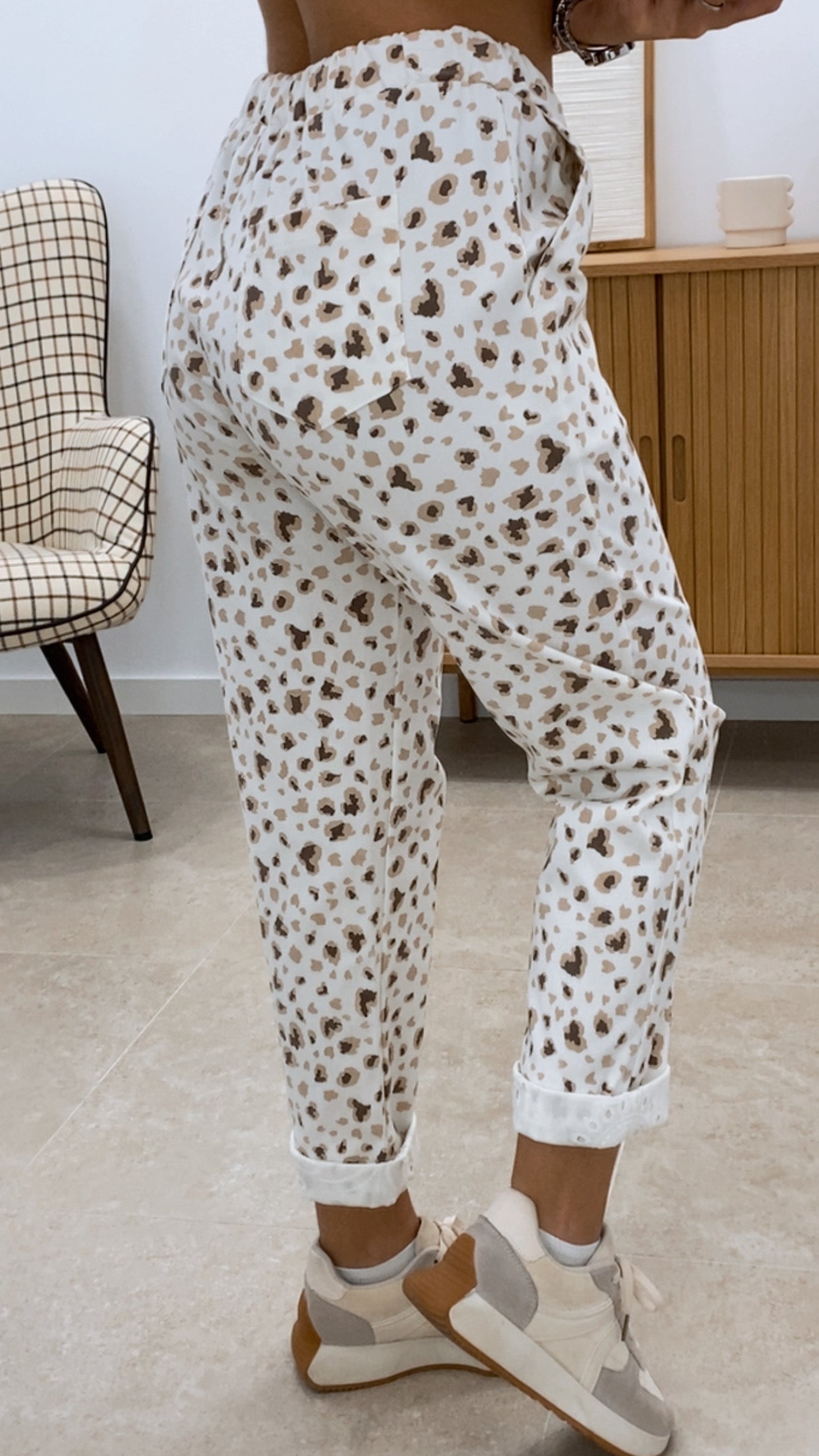 Pantalón confeccionado en tejido de viscosa con acabado elástico y resistente. Diseño versátil con talla única que se adapta a diferentes siluetas. Cuenta con cintura engomada para mayor comodidad y sujeción, ideal para un uso diario versátil. El estampado añade un toque distintivo a esta prenda de composición mixta: 78% viscosa, 21% nylon y 3% elastano, garantizando transpirabilidad y durabilidad.