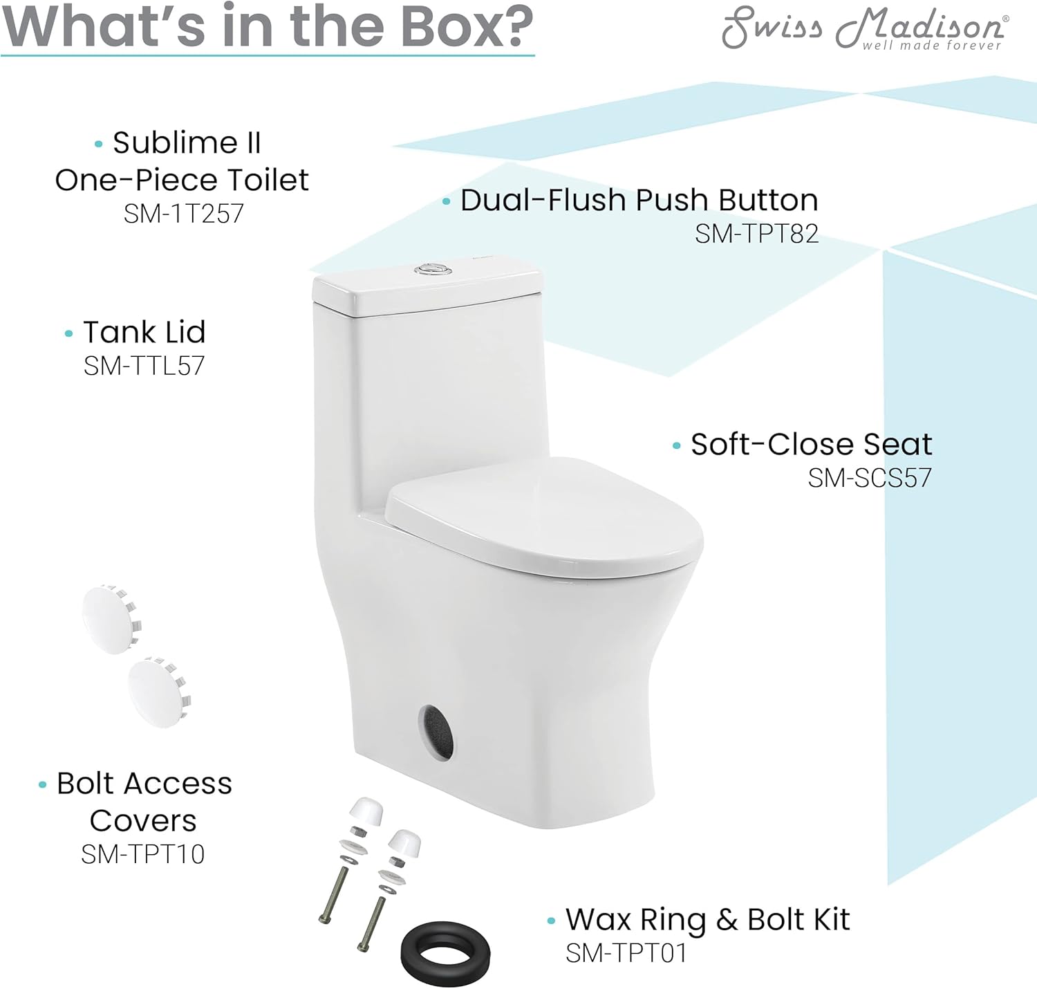 | Componentes incluidos | Tanque, tazón, asiento, anillo de cera, kit de pernos y tapas de cubierta |