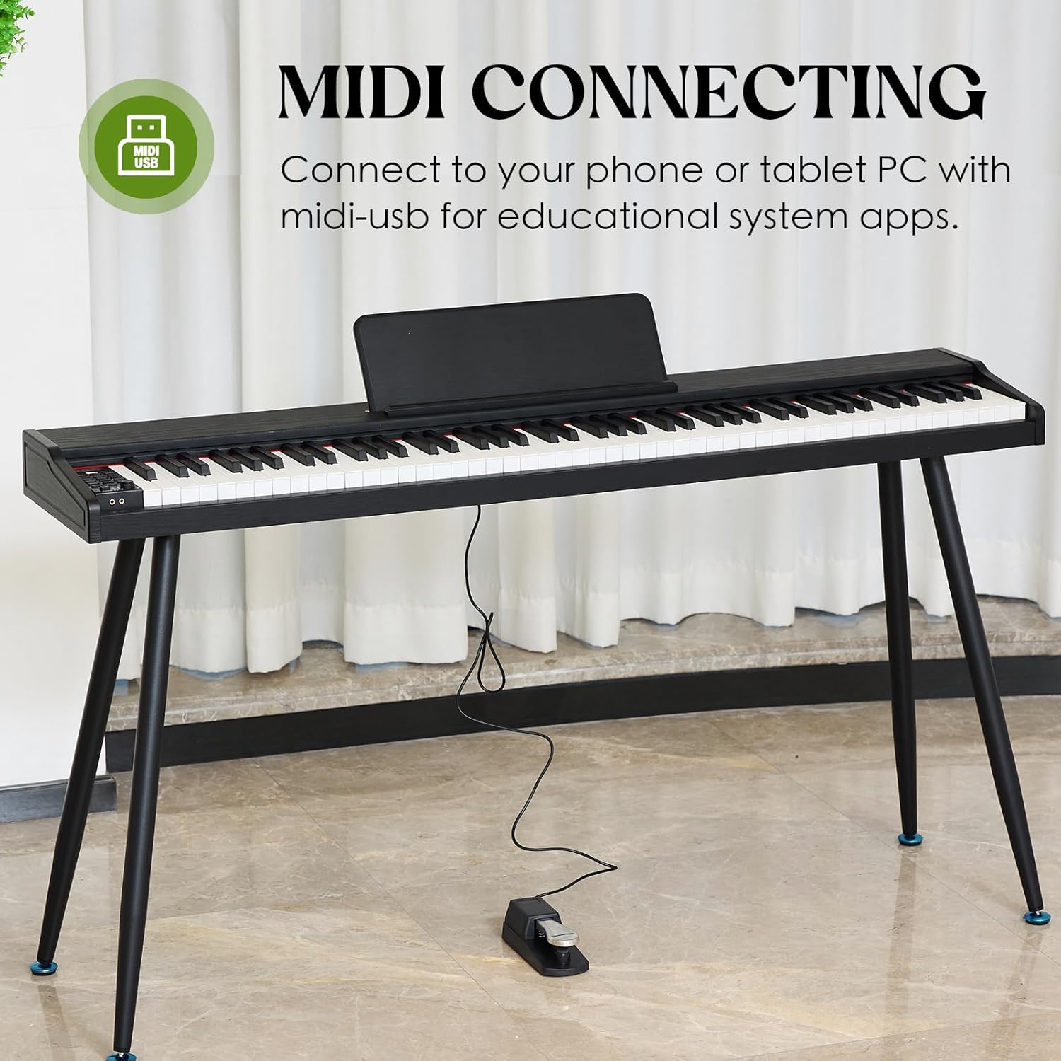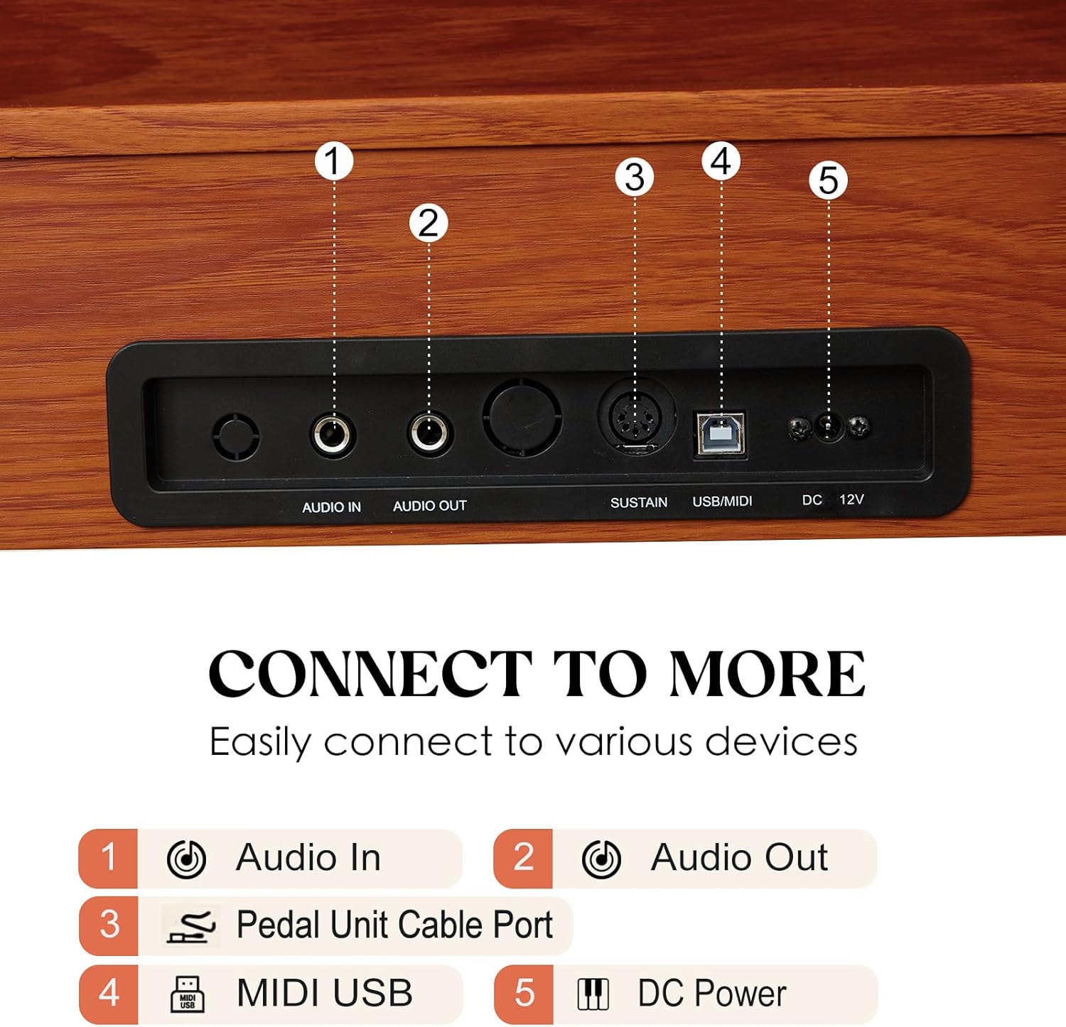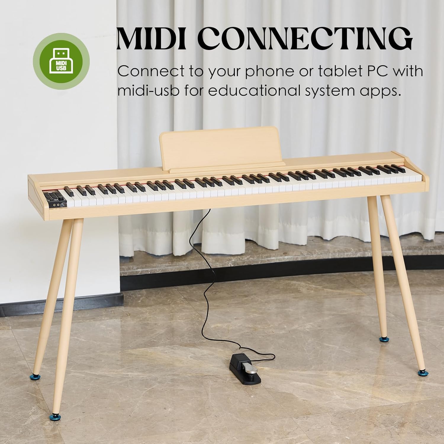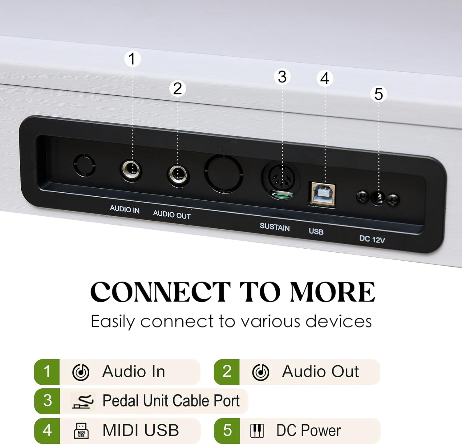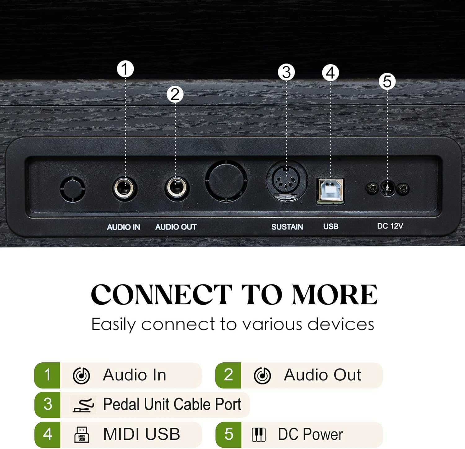 - Múltiples opciones de conectividad: con conectividad USB/MIDI, nuestro piano de teclado puede emparejarse con tu teléfono o iPad y luego conectarse a aplicaciones, así como conectarse a tu PC o tablet directamente para acompañamiento. La interfaz MIDI desbloquea tu potencial creativo, y el soporte USB permite la reproducción de MP3