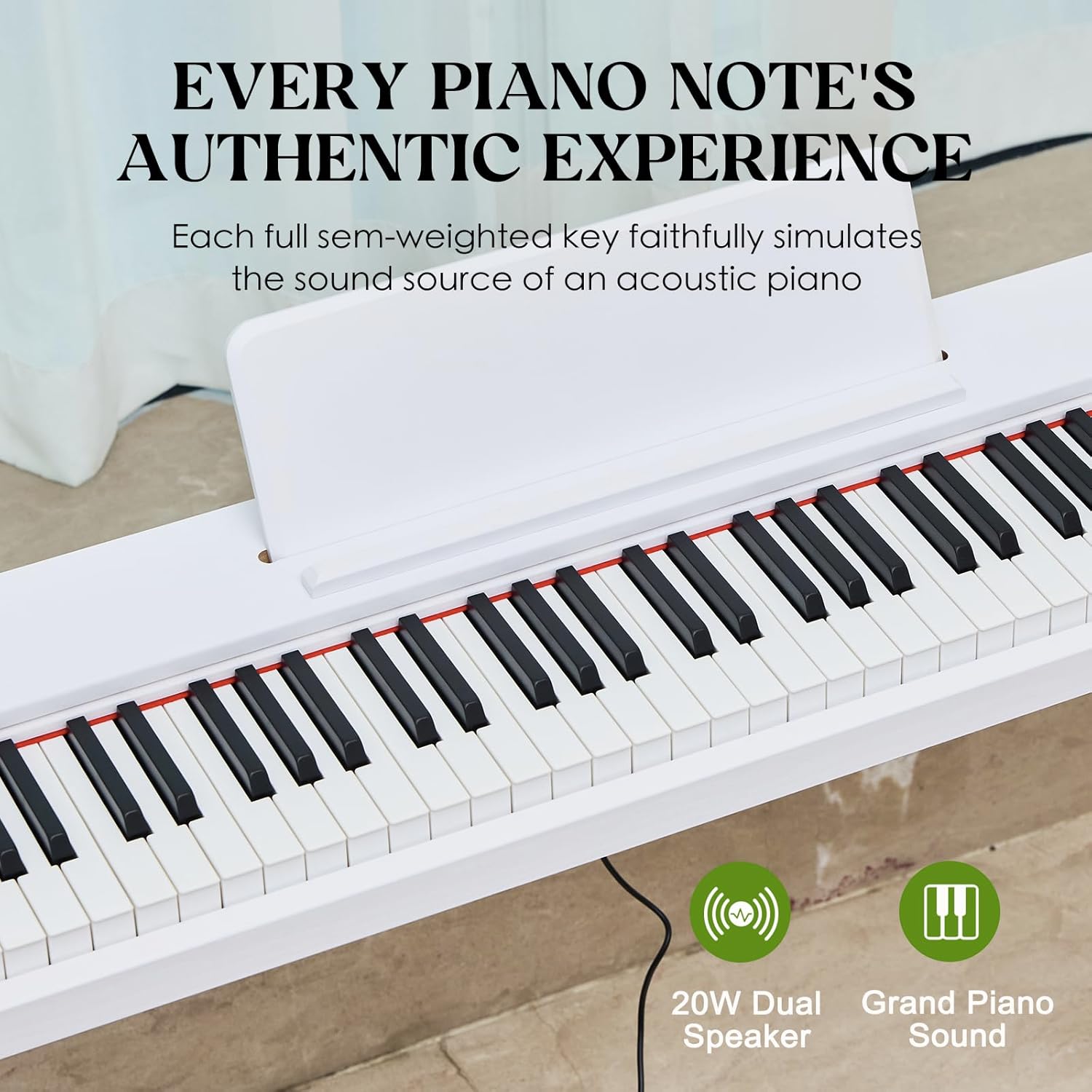 - Sonido de piano de alta calidad: este piano eléctrico está equipado con un chip sofisticado que con precisión, el teclado de 88 teclas simula el piano acústico. Con 800 tonos y 128 polifonías, este piano electrónico se adapta a tus diversos estilos de juego, haciendo de cada actuación una obra maestra