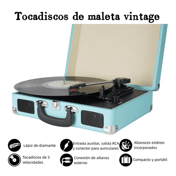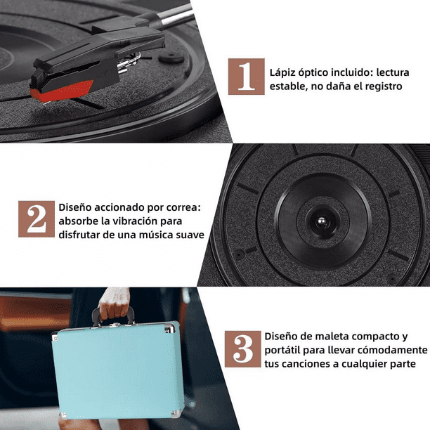 - Un tocadiscos de vinilo clásico Con un diseño clásico, es una mezcla perfecta de estilo vintage y tecnología moderna. Es capaz de reproducir tu colección de discos de vinilo, ofreciéndote la experiencia musical más pura. Múltiples opciones de reproducción Además de reproducir discos de vinilo, nuestro tocadiscos de vinilo también está equipado con función Bluetooth, lo que le permite reproducir música desde su teléfono móvil, tableta u otro dispositivo con Bluetooth a través de una conexión inalámbrica. Podrás disfrutar de tu música favorita en cualquier momento y lugar. Calidad de sonido excepcional Nuestro tocadiscos de vinilo está equipado con un sistema de audio de alta calidad que ofrece un rendimiento de sonido nítido y realista. Podrás sentir el tono cálido único y la delicada calidad de sonido de los discos de vinilo, lo que te permitirá sumergirte en el mundo de la música. Cómodo manejo y control Nuestro tocadiscos de vinilo cuenta con una interfaz sencilla e intuitiva que le facilita la puesta en marcha. Puede controlar fácilmente la reproducción, ajustar el volumen y cambiar de pista para disfrutar del placer de la música. Aspecto elegante y calidad duradera Nuestro tocadiscos de vinilo tiene un diseño negro sencillo y elegante. También presenta una calidad duradera para garantizar un uso prolongado y un rendimiento estable.