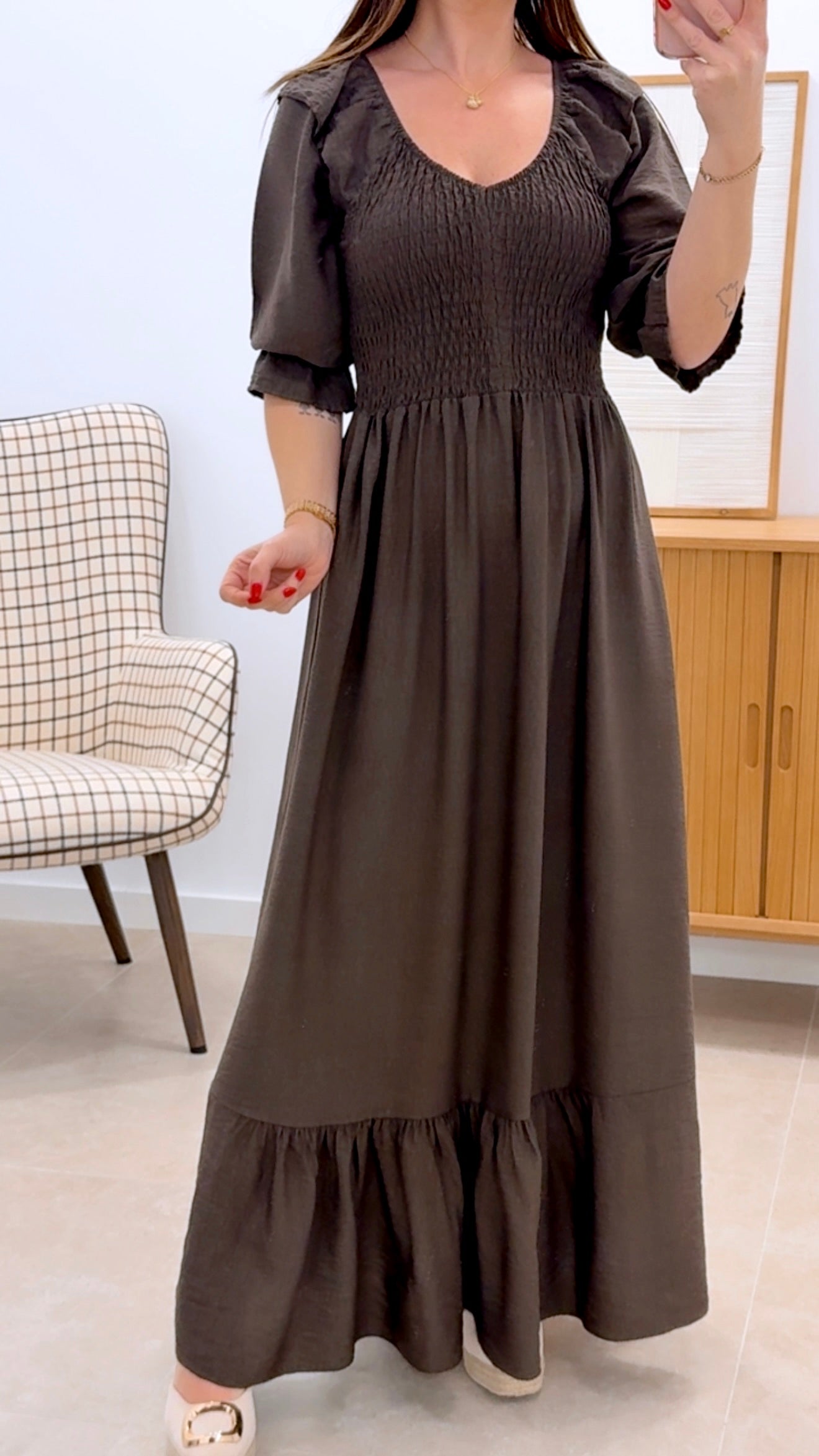Elegante vestido largo con manga 3/4 confeccionado en una mezcla de 87% viscosa y 13% poliamida que proporciona suavidad y comodidad. Destaca por su cuello en pico favorecedor y el detalle de nido de abeja en el torso que añade textura y movimiento. Disponible en color liso y talla única, es la opción perfecta para ocasiones especiales o uso diario versátil.