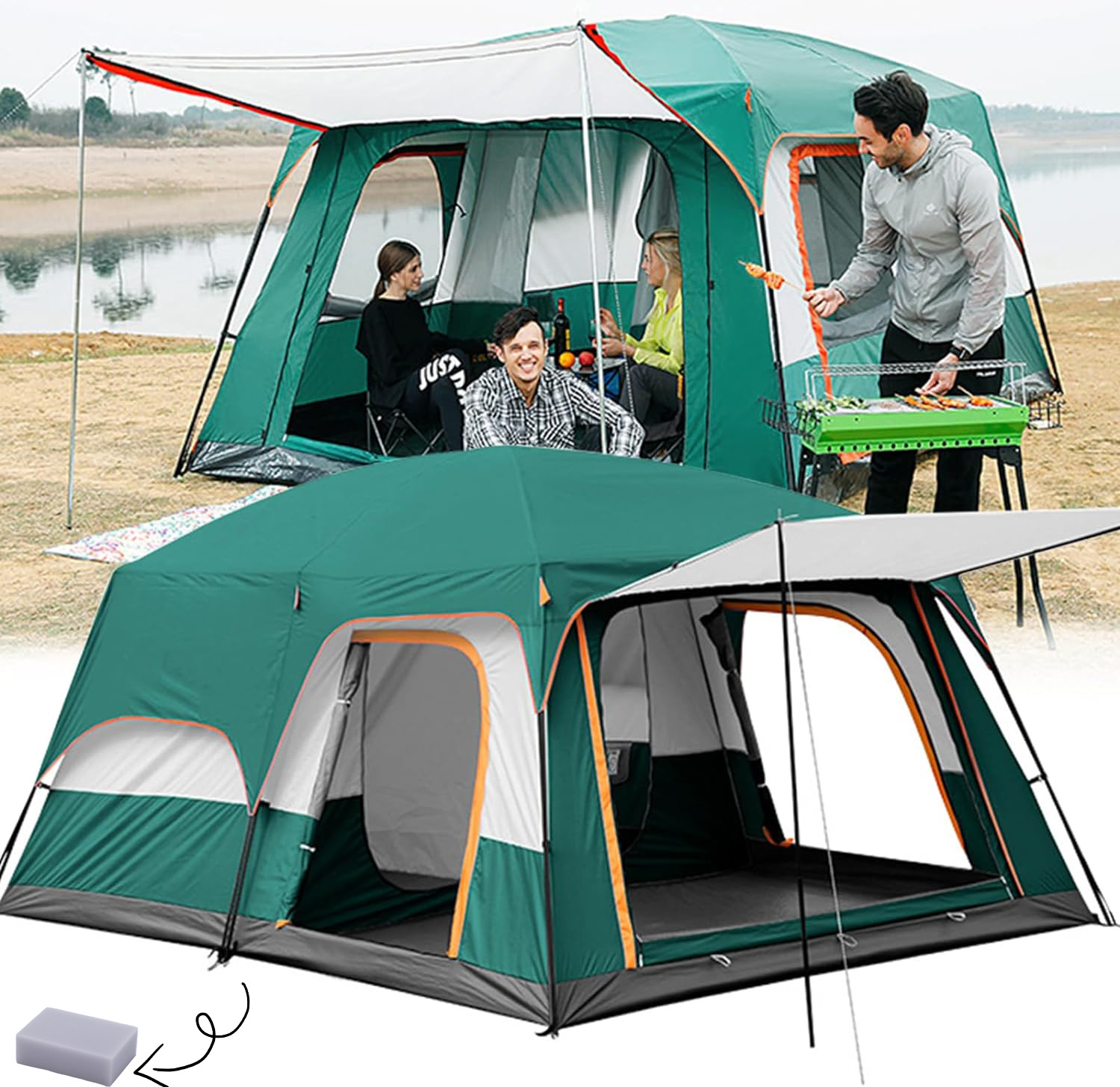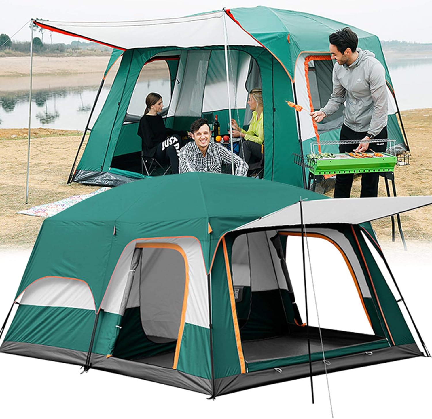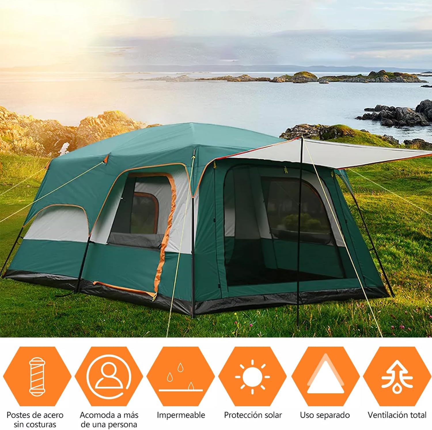 | Características | 👍Fuerte marco automático de aluminio, 👍Amplia zona de porche, 👍Dos dormitorios y un salón, 👍Pared y techo de malla grande, 👍Tienda de campaña para 5~8 personas |