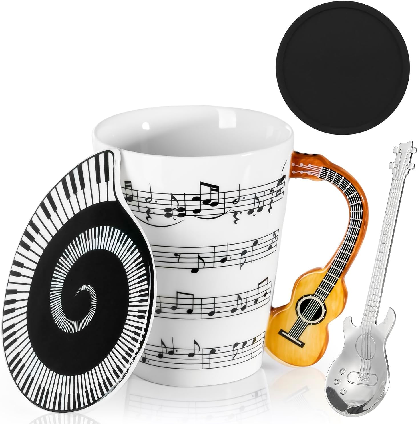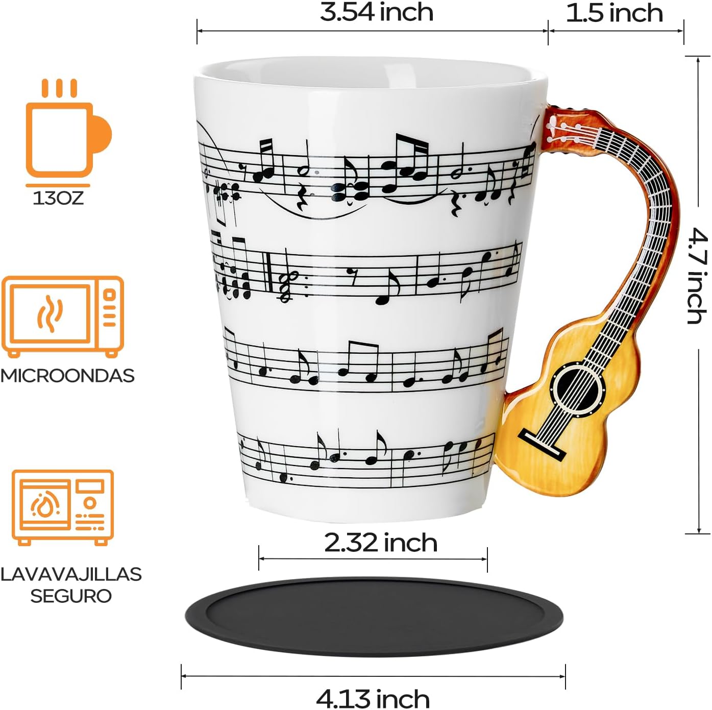 - ♫【Taza de guitarra】RAMSPIT taza ceramica de diseño único es una pieza musical. La taza tiene un diseño temático de notas musicales y el asa tiene forma de guitarra, además, el juego también viene con una bonita cuchara en forma de guitarra, y también se incluye una cubierta/posavaos con temática musical.